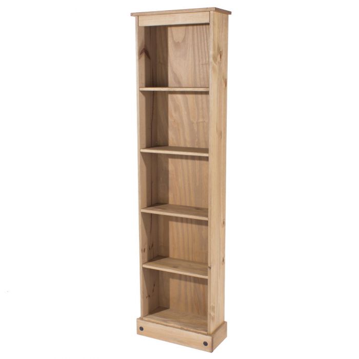Mexi Tall Narrow Bookcase from the Mex collection. Crafted from waxed solid wood finish enhanced with plinths and optional pin detailing. This practical Mex tall narrow bookcase features three adjustable and one fixed shelf.