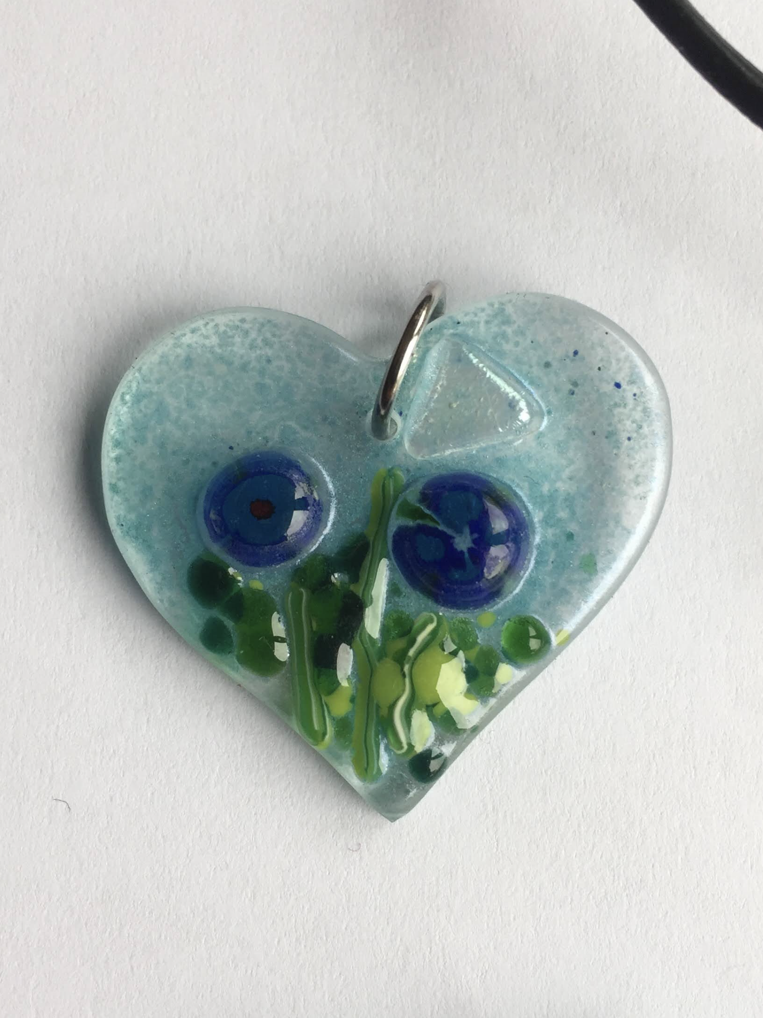 Fused glass floral heart pendant with blue flowers made using recycled glass.